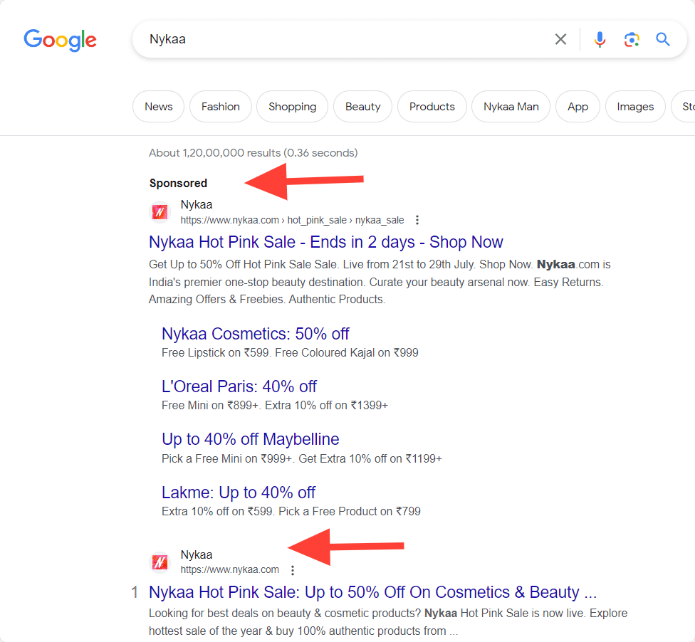 As you can see from the above picture, Nykaa has bid the keyword for their own brand and it appears at the top with Sponsored site. And below that the official page is also ranking second. Though they have the organic results, they have also done the PPC and this is how Google Ads works.